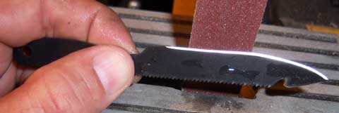 I used a very coarse belt to rough out the shape I wanted. Notice that I'm keeping the blade wet as I work. I keep a jar of water next to my sander, and dip it when it gets warm. If you let it get hot, you can kill it's ability to hold an edge!