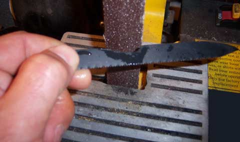 I used a belt sander, but this can be done with a file, grinder, or even a stone (if you have lots of time). The sander makes quick work of this. It took me about 3 minutes to rough the shape, and another few minutes to give it a shaving edge.