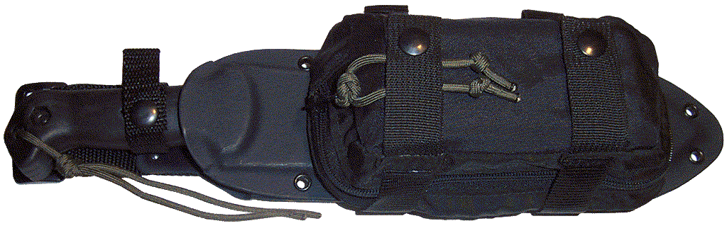 I have made an external modular pouch for this knife to add my survival kit to it when required. Whereas this Kydex sheath has plenty of attachment points, this task was an easy matter. This kit pouch is wearable either on the knife itself or can be carried separately on the belt. It is important that it be wearable independent of the knife, as here in the Peoples Socialist Republic of Massachusetts, there are those busybodies who get frightened at the sight of a large knife on someone's hip. When in places like state parks, I will substitute a much smaller blade.