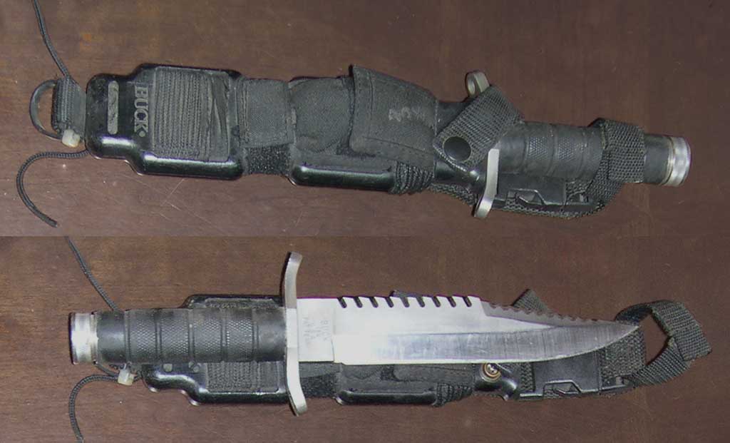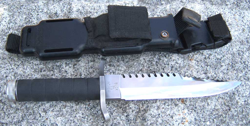 Although many of you may consider this to be a form of blaspheme, my Buck 184 is actually a working blade, and has seen almost a quarter century of use and abuse. Yes, I regularly beat the crap out of a "collector's item". It has accompanied me over hundreds of miles of trail and many a day in camp (chopping wood, clearing trail, whittling, etc). Finally, it went with me through the United States Air Force Survival School in Washington state, and then on to multiple tours in the Middle East