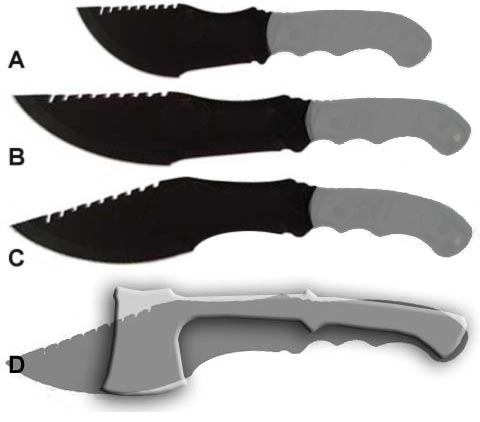Blade “C” is something I might actually consider hauling into the field, but it exists only in my imagination. In figure D's hatchet comparison, the hatchet’s steel would be thicker at the top to allow for extra weight at the front. The blade design makes up for that by having the extra blade area and thus extra weight forward of the chopping area.
