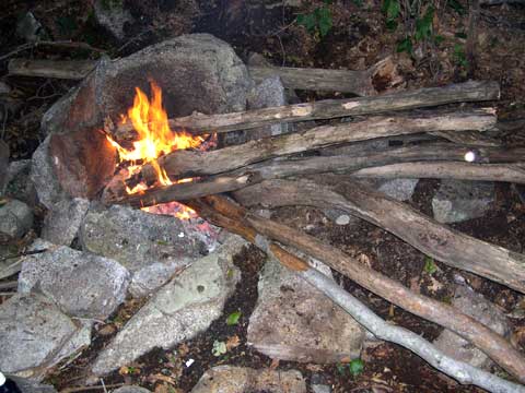 A "Lazy Man" fire with a nice 3-sided stone fire pit, and a high back to reflect light and heat back into camp.