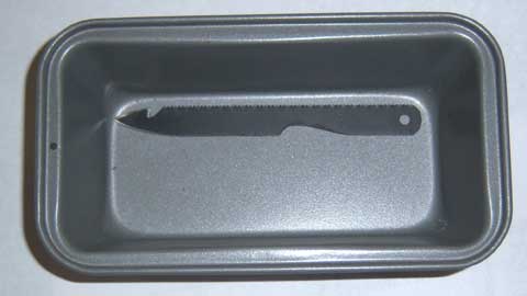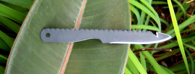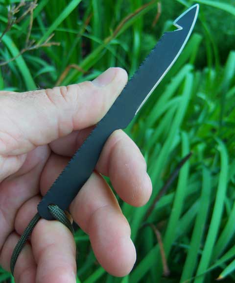 Okay, so it's a piece of a hacksaw blade. The other day I stopped into my local hardware store, and saw a 10 pack of hacksaw blades on sale for $1.99. That got me to thinking about a very small blade that could be packed in my survival kit.