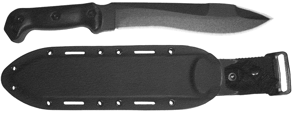 Note that the slight forward cant of the blade and the way that it widens towards the tip are reminiscent of the Kukri. For those that do not want to or cannot make the modifications I described in the Kukri Modification page, I would recommend this as a no-frills, all-business field knife. The only modification I made to this knife was to change the false edge that runs for about two inches back from the tip. This comes with a false edge, but I have put an actual edge for effective backslash ( I believe that the proper term for the rear edge is a "swedge", but I'm not sure).