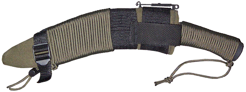 The last step I took was a much needed rebuild of the sheath. The original is wood wrapped in goatskin. Now I know that in that area of the world (India, Pakistan, etc) cows are not used for food or leather goods, but I must say that they should reconsider. Goatskin is the crappiest, thinnest, papery junk that ever graced (or disgraced) a sheath (see Figure 3). I peeled all of this away (it tears like construction paper) to expose the wood liner halves. These are decent to use, as the odd shape of the blade makes for difficulty when trying to construct a traditional sheath. I sanded these out, and then treated the wood with Thompson’s water seal. These were then painted olive drab, and I fashioned a heavy canvas exterior and heavy nylon strapping to make the frog and external sheath. The outer sheath was also strategically cord wrapped with 550 cord.