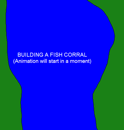 In this picture, I show 4 fence sections across a narrow point in a stream. The points facing inward from the two openings are sharpened twigs. These ensure that once something comes into the corral, it is "encouraged" to stay there.