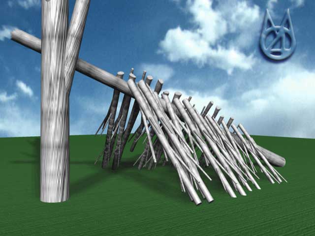 The Debris Hut shelter is a very basic shelter to make if you have access to a lot of branches and leaves. As you can see in the picture below, the frame is basically just a pole leaned against a tree (or stump, rock, etc). Branches or deadwood are leaned against the pole to form a sloped roof.