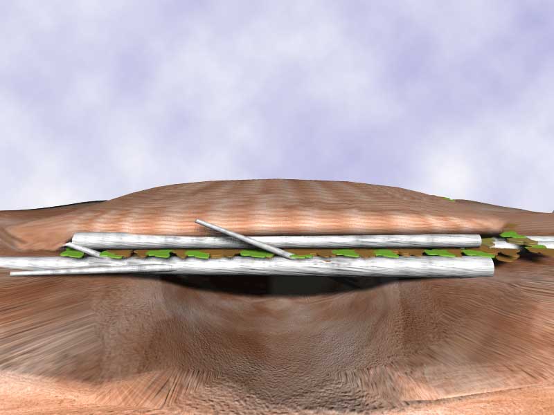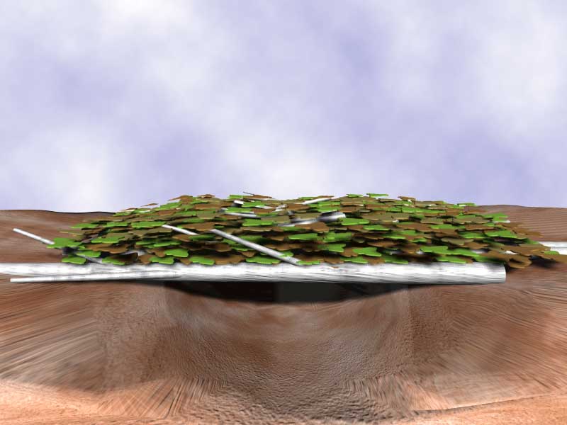 Step Two: Drag large branches and fallen deadwood over top of hole (if you are constructing this to last, use fresh cut (small) trees to make poles to cover the hole. Plug large gaps with sticks and brush as best you can.