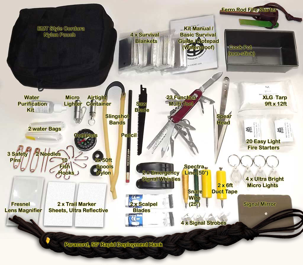 This kit is an ideal family or small group survival kit. It has most of the same gear as my other kits, but has an extra large tarp, 4 survival blankets, 20 Fire Starters, 4 lights, 4 strobes, 2 whistles, 2 sheets of trail marking material, extra wire and cordage, and includes my home-made spear head. NOTE: I've left plenty of room for additional gear!