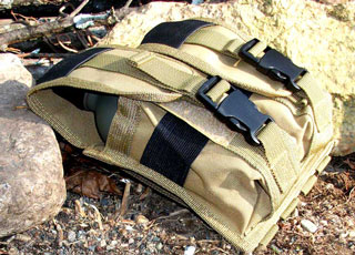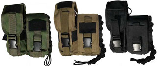 High quality, heavy cordura nylon, double belt pouch. Dual closure with both Velcro and cinch straps so your gear stays put no matter what. Stretch loops on top and sides allow stowing of extra gear on the outside of the pouches, and provide compression fit to the pouches. MOLLE compatible... attachment system will attach to belt, pack, or pretty much anywhere. These work great as a kit pouch/water bottle combo as shown, or if you want two distinct kit sections. If you want two 'armored' kit areas, order this pouch with two cook pots. NOTE: BLACK POUCHES ARE BACK IN STOCK! Everything except coyote tan is now in stock and ready to ship! Camouflage pouches available... see drop down menu! |